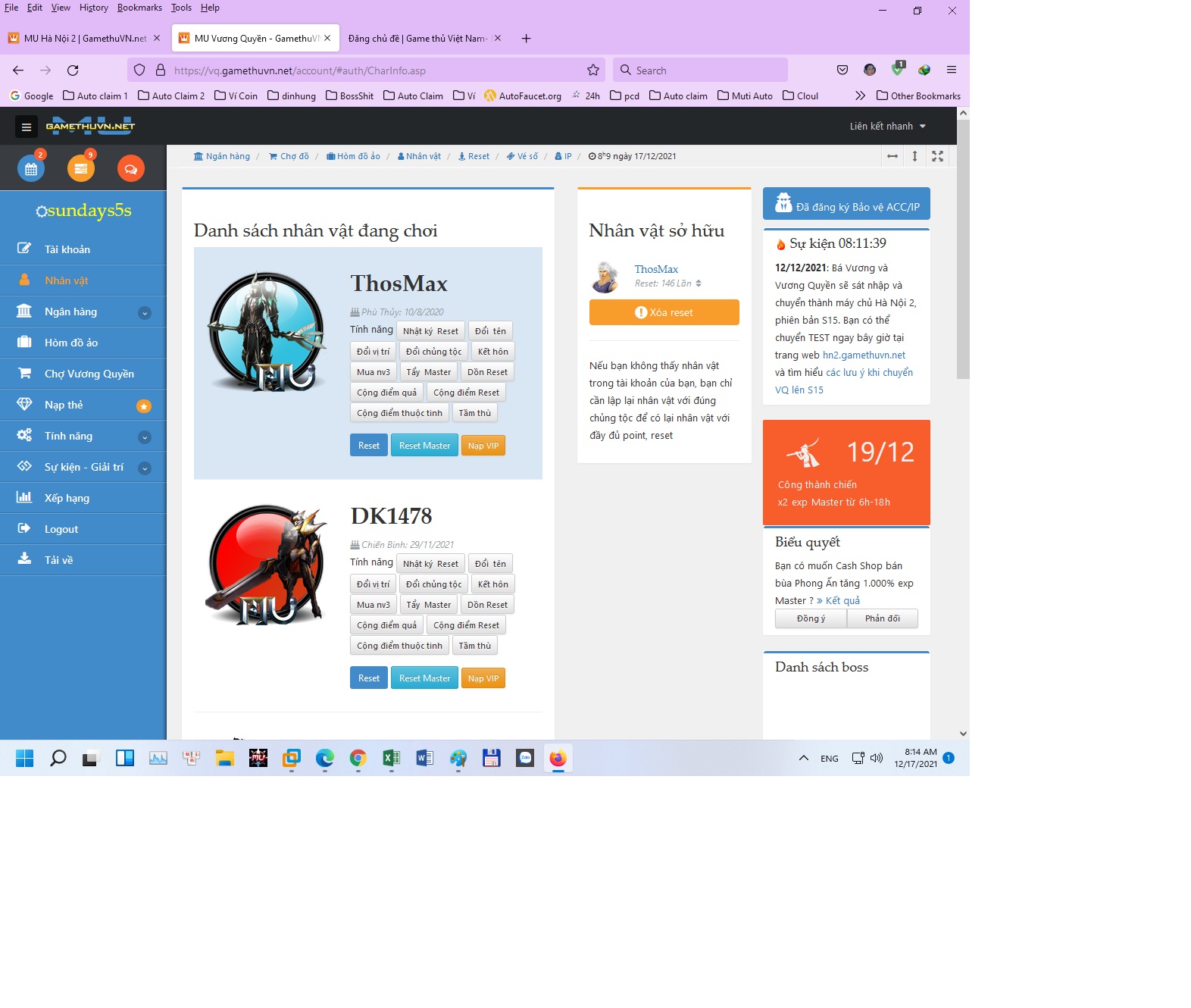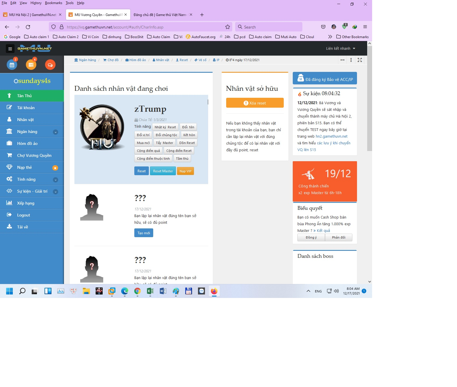 Nhờ Ad xem lại trường hợp tôi. Tháng 11 tôi có dùng 2 acc bên Vuong Mệnh để chuyển 2 nhân vật của 2 acc bên Vương Quyền tham gia thử nghiệm ss15. Ngày 12/12 lúc 18h tôi chính thức chuyển 2 nhân vật của 2 acc này từ Vuong Quyền và đã chuyển xong. Nhưng hôm qua tôi vào 2 acc này VQ ss15 thì không có nhân vật nào, vào trang web quản lý mới login vào 2 acc này cũng không có nv nào, vào chuyển nv thì bạn "không còn nv nào để chuyển" Mong Ad xem lại giúp, 2 nv trong 2 acc là: acc sundays4s, tên nv Ztrump acc sundays5s, tên nv ThosMax Cảm ơn.