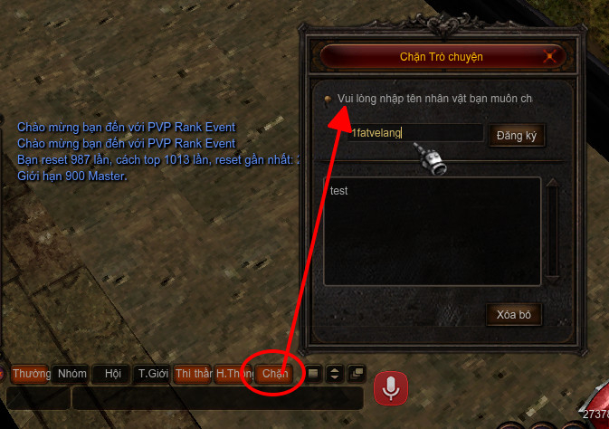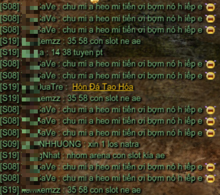 Tôi tạm thời cấp quyền block chat cho 10 chủ Guild có tên dưới đây Game chủ guild AnhEmNEW Tequila chủ guild LegendMU PHUCYEN88 chủ guild VINHPHUC Avatar chủ guild WhatLove Scent chủ guild Avengers KyChu chủ guild KhungBo KyNiemAE chủ guild AnhEmTao NaTra chủ guild HALONG TomMiss chủ guild ChienHuu vodoi chủ guild vodoi ChienThan , AndreyTran chủ guild ThacLoan 1. Cách khoá chat: ae đăng nhập vào game, gõ /chatblock tennhanvat so_phut ví dụ muốn khoá chat nhân vật admin trong 60 phút, gõ /chatblock admin 60 2. Quy định: chửi nhau trong game là chuyện bình thường, Game không phải là họp chi bộ đảng nên không cần nghiêm túc. Tuy nhiên việc lôi bố mẹ, vợ con gia đình vào là không được Yêu cầu anh em được cấp quyền, chỉ khoá nhân vật khi + Có câu nói xúc phạm đến gia đình hoặc spam liên tục trên kênh thế giới từ 10 câu trở lên + Các câu chửi thề không tính là xúc phạm gia đình ( bố mẹ, kiểu ***, bố mày, mẹ mày ...) >> AE có thể gửi cho admin để cho vào bộ lọc từ + Mỗi lần khoá, vui lòng chụp hình, có hiển thị thời gian và gửi zalo cho admin để làm bằng chứng + Anh em sử dụng công cụ để trả thù riêng, sẽ bị thu hồi quyền ! 3. Anh em không thích nghe chửi, có thể chủ động cho tên nhân vật vào danh sách chặn riêng của mình: Các ví dụ đáng khoá ngay lập tức