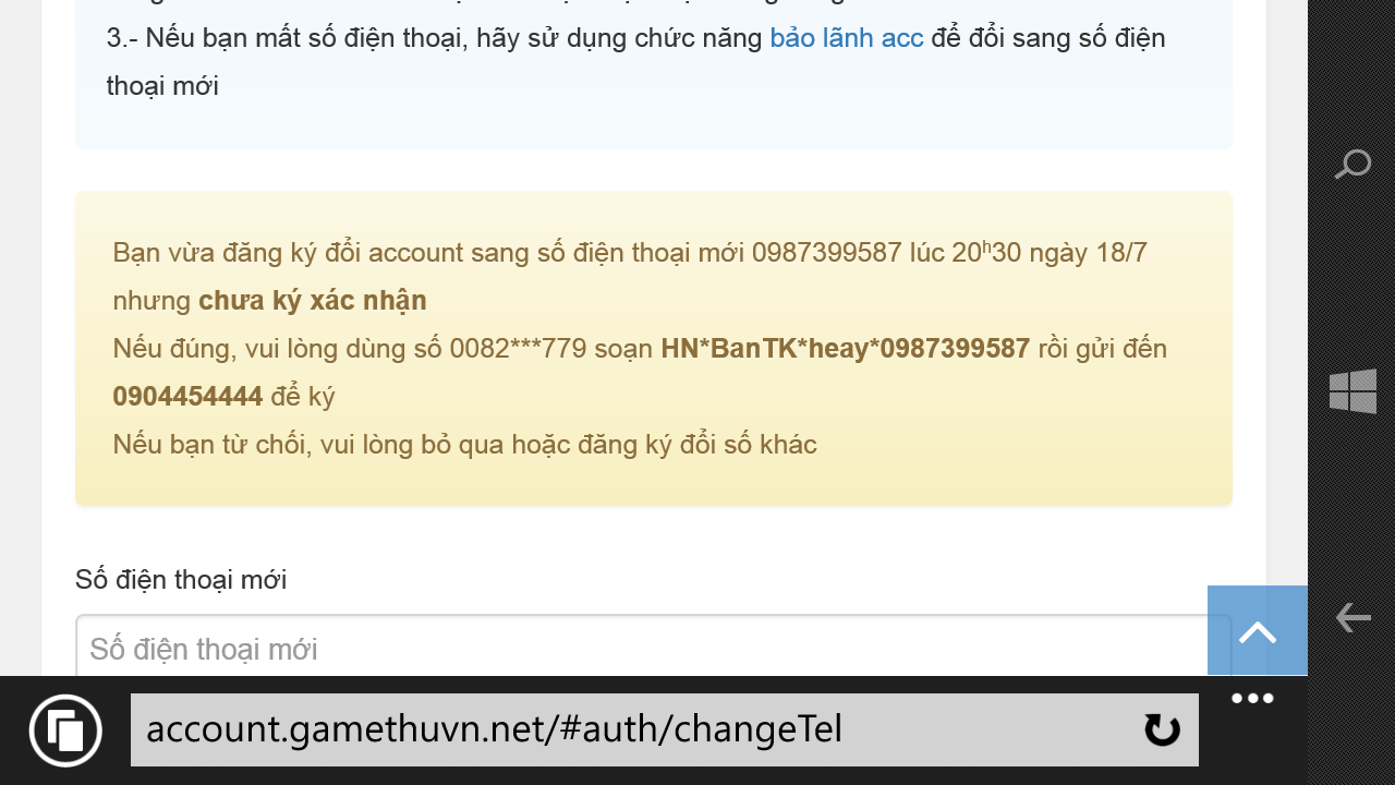 Thông báo Đổi số điện thoại đăng ký account qua SMS