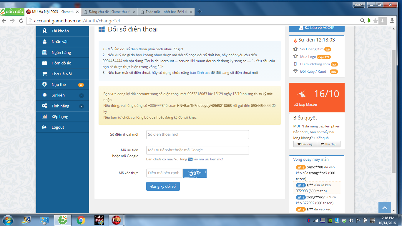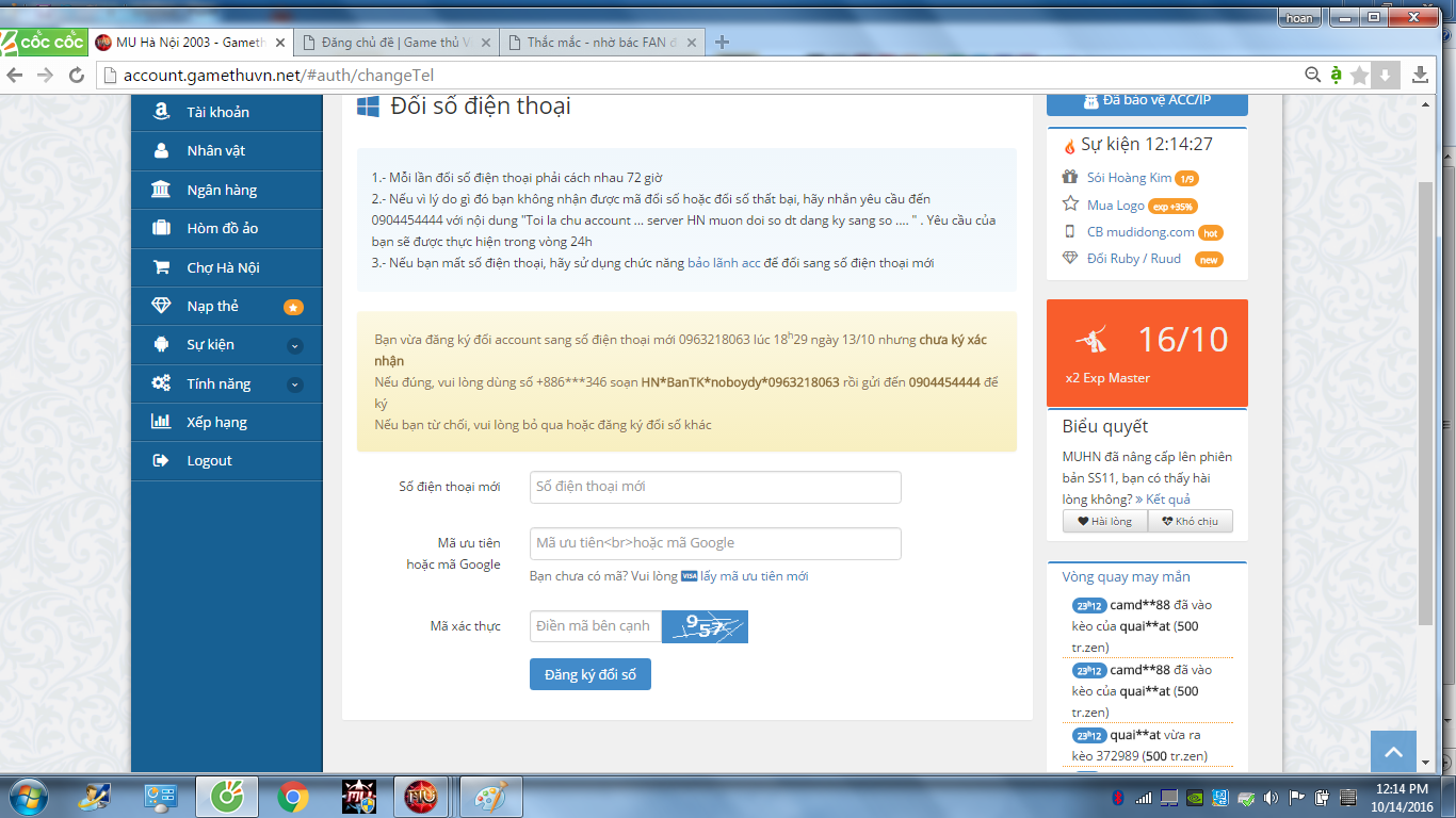 Thông báo Đổi số điện thoại đăng ký account qua SMS