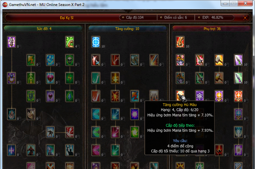 3. à bổ sung thêm tý: Gong máu hàng thứ 4 là tăng tốc độ hồi phục nội lực, hàng thứ 5 là tăng tổng lượng mana (xanh) và hàng thứ 6 là tăng tổng lượng nội lực. Hope nhớ là nếu DK tăng hết 3 hàng gồng máu đó thì DL được gồng máu sẽ không bao giờ hết nội lực nữa