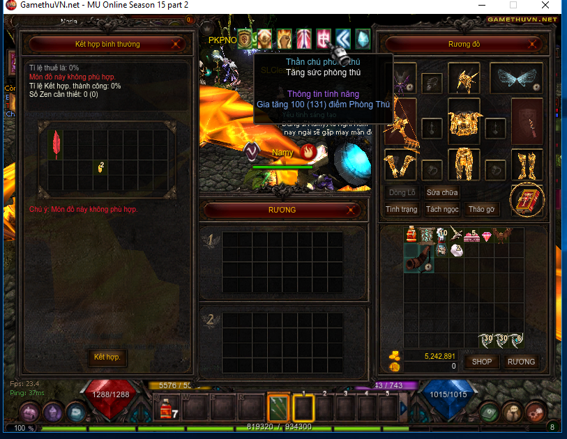 3. Bạn click vào ô "Tách ngọc" ngay phía trên rương cá nhân (phí trên ô Kỳ Lân) rồi chọn ngọc muốn tách nhé.