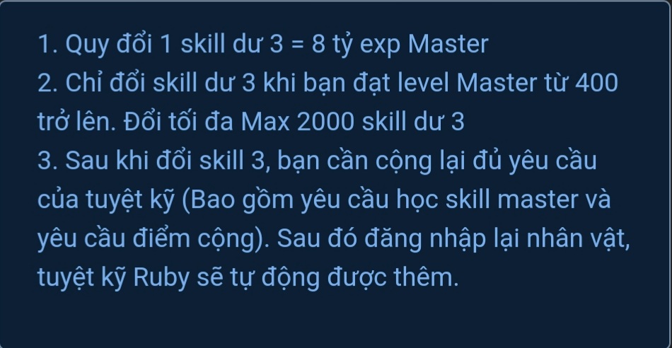 Skill dư quy đổi 8 tỷ/1 point, thay đổi so với thông báo ban đầu. Thay vì 400 level master đổi 25 skill 3 dư, chúng ta sẽ được 38 point skill 3 dư dựa theo cách quy đổi mới