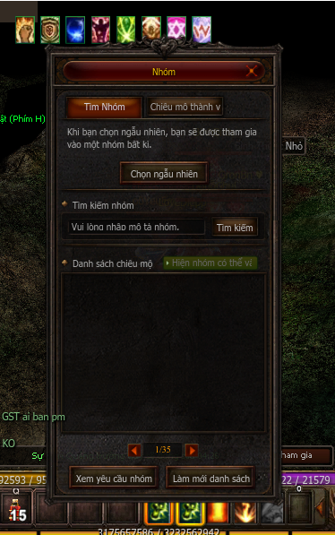 6. vấn đề là mình chơi có 1 acc. phải lập 1 acc khác xong chơi cho có ít lv rồi tìm nhóm ở acc ý ->> chuyển sang acc chính mình tìm theo tên