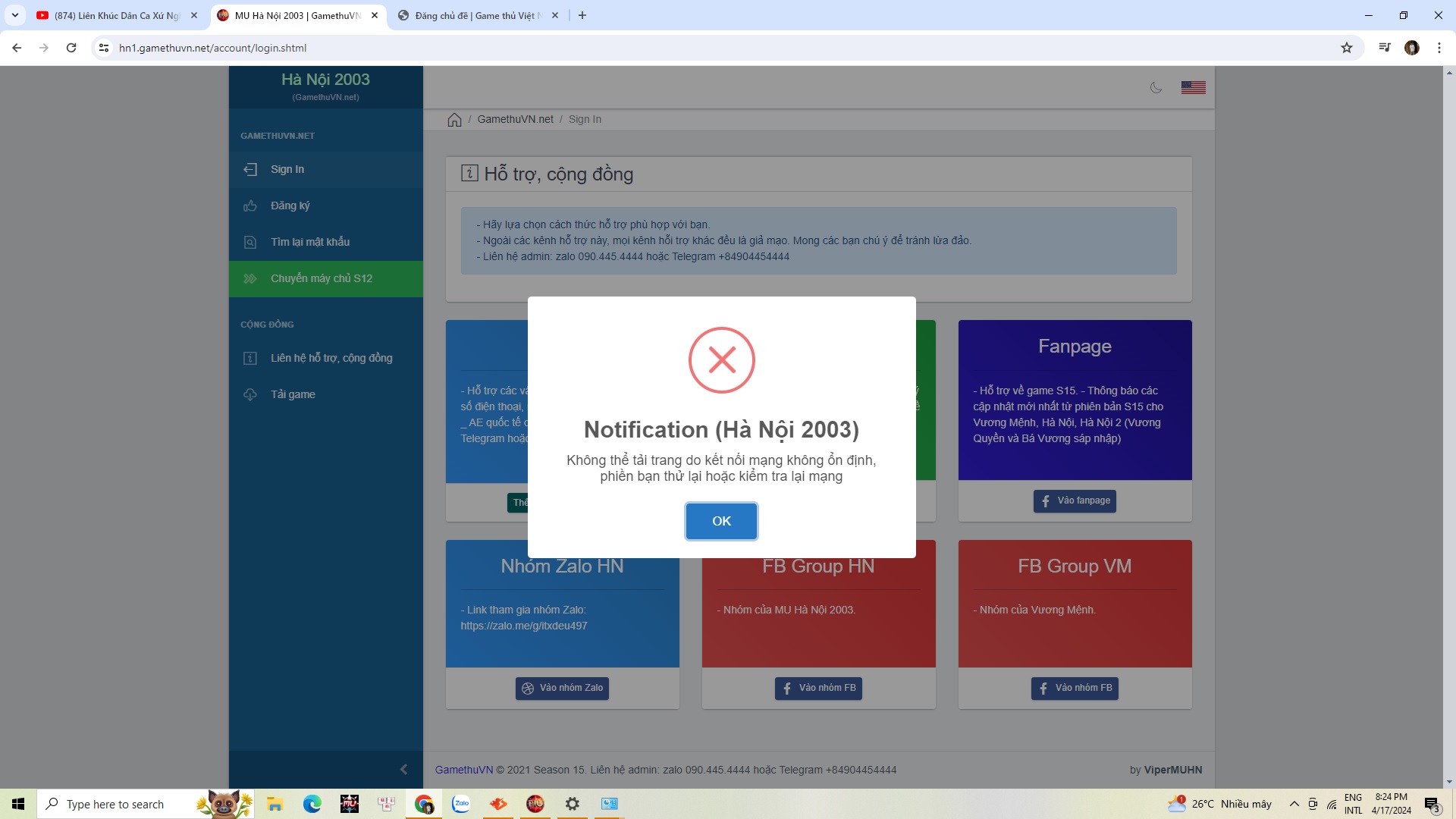 các bác cho em hỏi sao em ko vào dc web của game nhỉ mà game vẫn vào được
