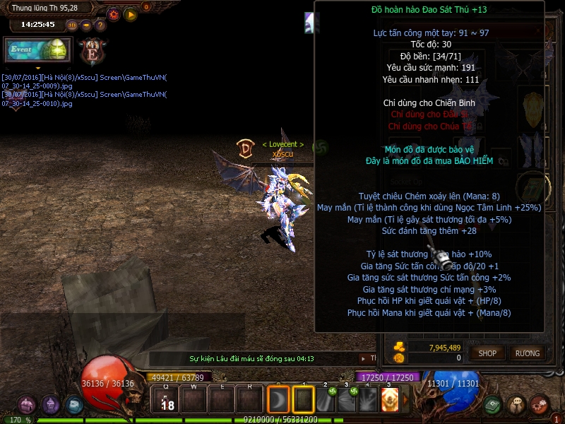 - Các đồ có trong acc: cánh cấp 2 dk full 13, 2 nhẫn băng full 13, 1 pedan lửa full 11, set rồng xanh full 13, 1 đao sát thủ full 13. Tất cả đồ này là đồ nhóm 3 theo acc, ko gửi được lên hòm đổ ảo, không giao dịch được.