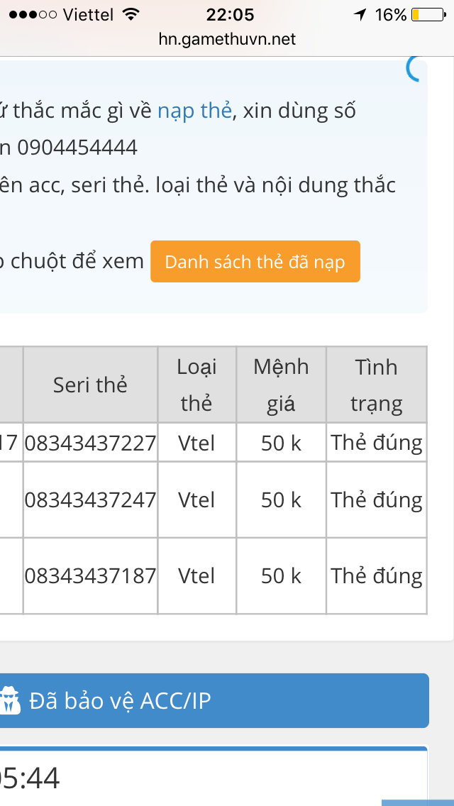 5. Ảnh thẻ có chứa số serial, mệnh giá trên và nhật ký nạp thẻ trên quản lý account:...