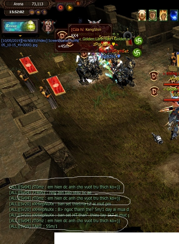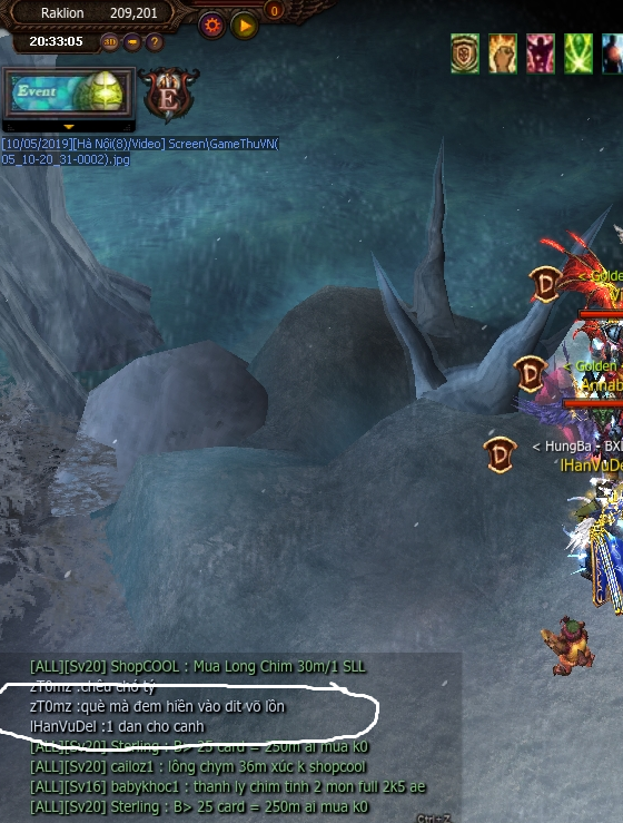 Bạn xem cái ảnh ở #25 có ngày giờ hay không giúp mình. Ảnh được phép chỉnh sửa để che máu, cột SD, cột mana, cột tím, skill, master, point, team trong party, pet. Nhưng cái quan trọng nhất là ngày tháng và tên nv đang chửi, chửi dạng spam tối thiểu 3 câu hạng nặng mới được xem là hợp lệ. Ngày giờ trên màn hình máy tính không chấp nhận. Bởi nó có thể được sửa lại như ý cá nhân muốn. Chỉ chấp nhận ngày giờ hiển thị trong game.
